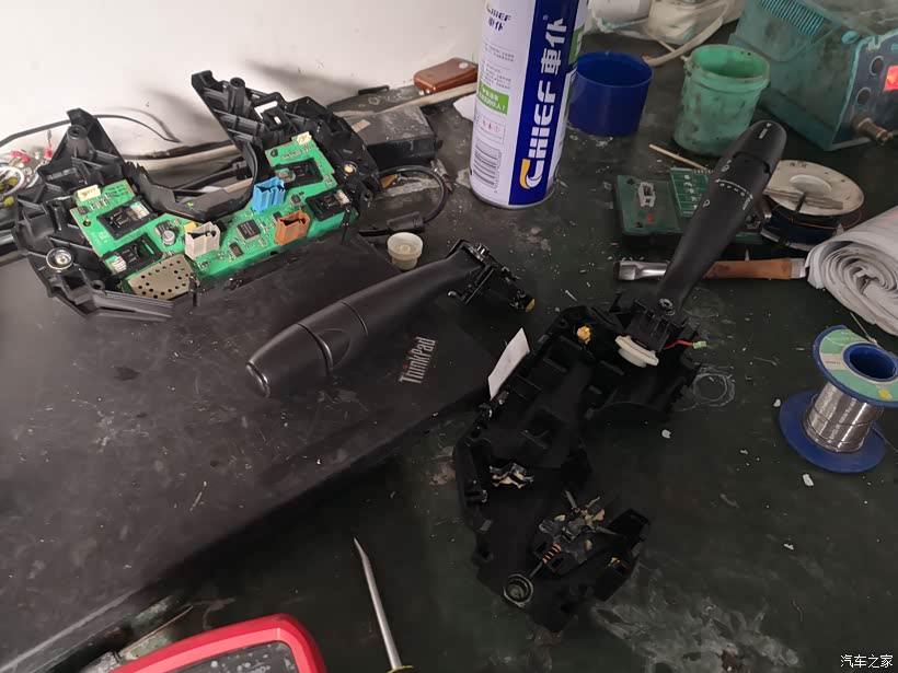 师傅很快把组合开关“大卸八块”,并对线路进行检测,很快发现了问题,既不是板子坏了,也不是触点脏了,而是一根细如纤毫的信号线断开了,焊好后复装试车,组合开关故障消除,所有功能恢复如初,整个拆卸、检查、处置、复装前后也就一个多点小时。老板挺厚道,只收取了少许工时费用,修复过程虽然耗时不多,但其中的专业附加值是非常高的。