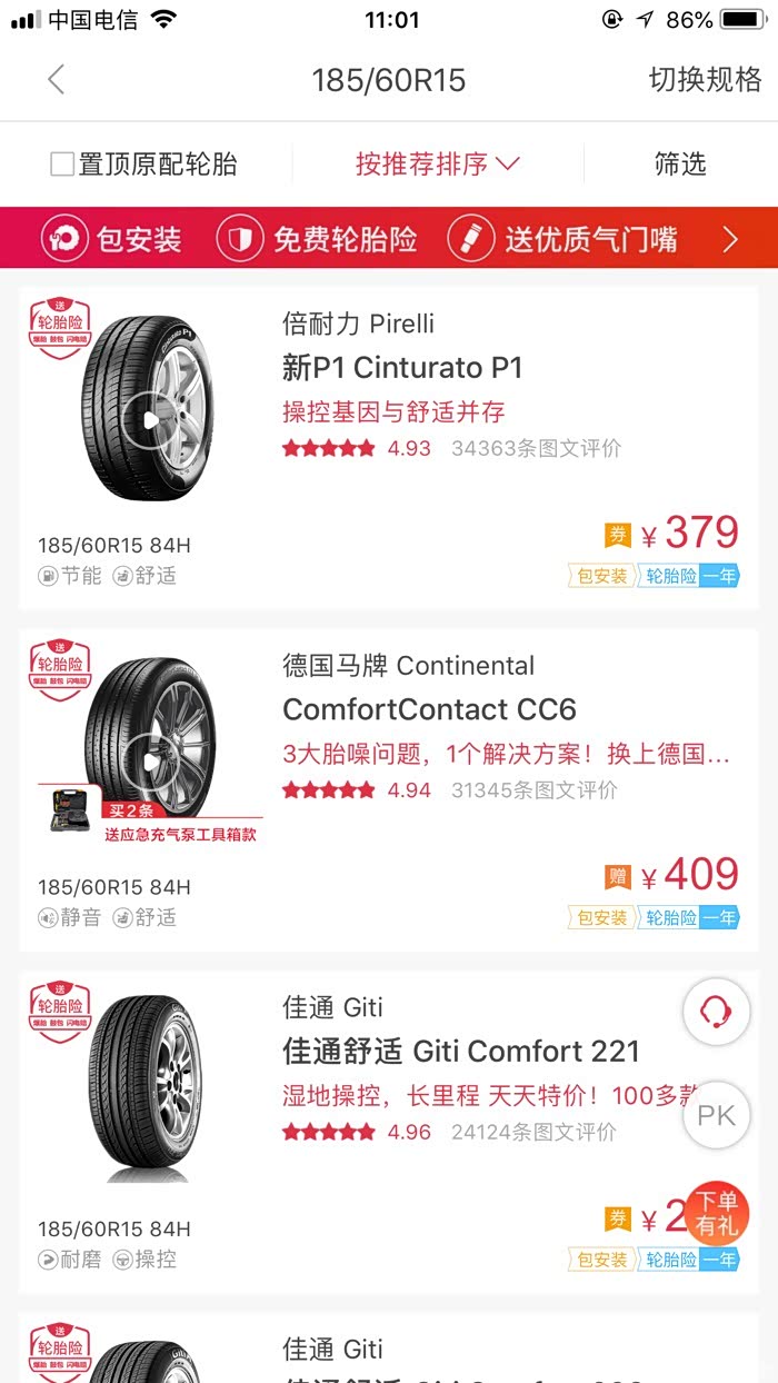 我是13款捷达,轮胎是185/60 R15,想要选择好的轮胎很多品牌压根就没有这型号产品,本来优先考虑米其林轮胎的结果它只有一款,而且是耐磨型的,直接pass,其他品牌类似情况,只有一款适合我的要求,那就是马牌cc6,纯粹为了静音舒适出的产品,当然缺点也很明显:胎壁只有一层!一般最少两层,问题就是胎壁很脆弱,使用要非常小心翼翼!