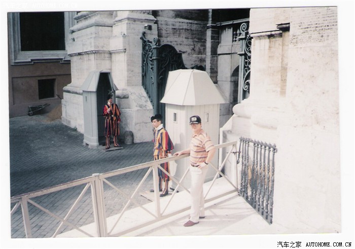 我在梵蒂冈国大门外留影;国门卫士清一色瑞士人(有典故);据说其彩条服装是米开朗基罗设计的;