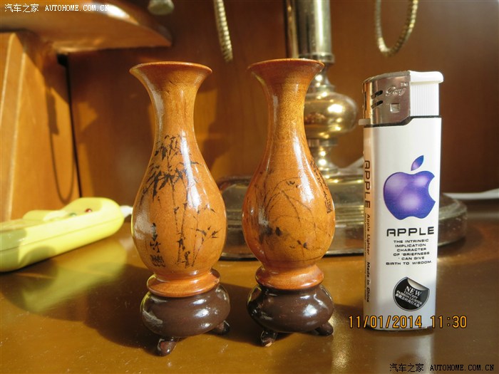 木质微花瓶(仅比打火机高一点点儿),41年前(1975年)做车工时自己车制;找画工画的水墨,自己雕刻底座、刷油完成;现仍摆在酒柜上;