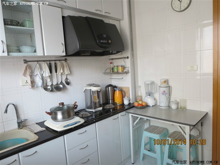 厨房很小(6㎡左右)但设计精巧,橱柜由自己设计图纸,购料找木匠施工;
