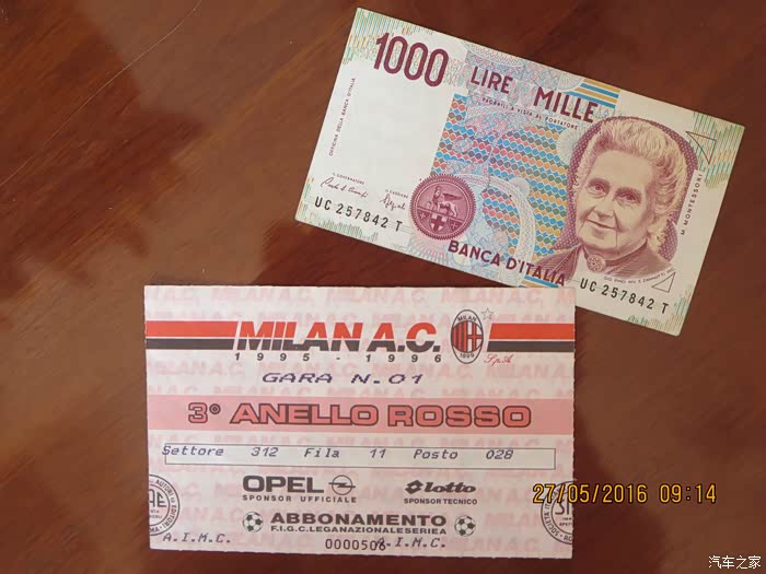 这是看球的球票,位置很差的高台座位,票价折人民币300多,当时可不是小钱哦(我月薪还不到200);上部是意大利纸币(1000里拉);