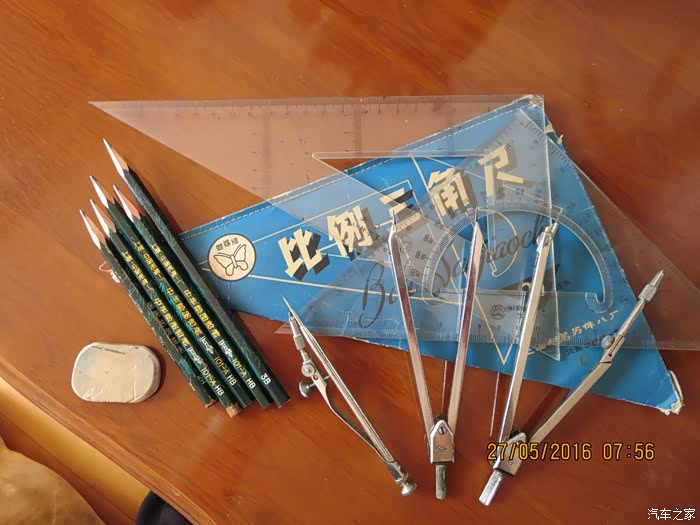 当时绘图用的工具:三角板、划规、中华铅笔及橡皮;