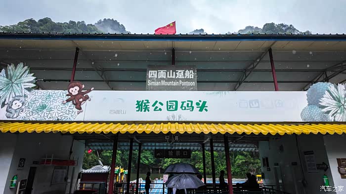 因为预订的亲子酒店在东门,所以我们选择从四面山北门进从东门出,在北门附近的餐馆点了四面山出门的双椒鸡、大脚菌滑肉汤和几个小菜,没有想到味道倒是出奇的好,虽然地处景区,价格却非常亲民。午饭后雨大了起来,远处的山上云雾缭绕,和同伴商量之后决定先去猴岛,孩子们嘛,对于动物那是喜欢的,不过猴子的名声不太好,喜欢抢东西。从餐馆到猴岛的渡口步行只要几分钟,从渡口上猴岛需要坐船,船票30元一人,往返,1.4米一下儿童半票,我们在渡口处买了10元一包的膨化米果准备去喂食猴子,结果在猴岛里面要贵很多。