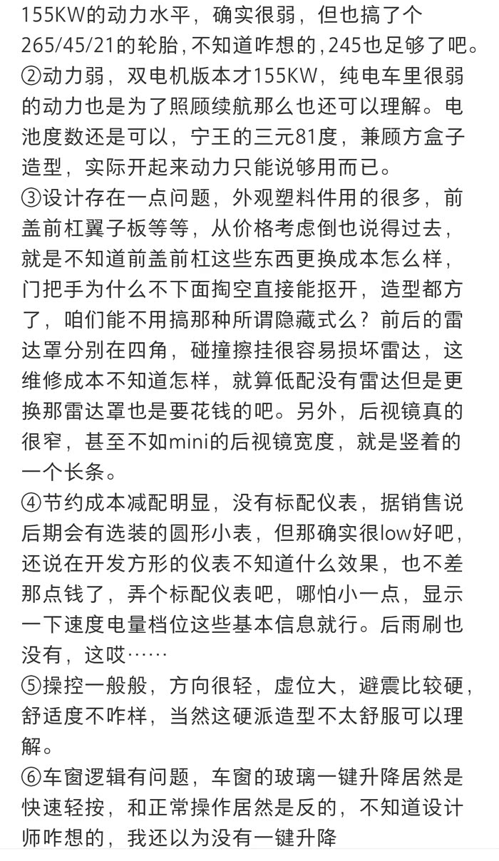 因为胎宽和风阻问题,为了保续航不得已把电机功率降了。可能根本没有意识到这款车潜力多大,icar03已经可以爬石头过坎中度越野了,这玩意265太宽,接近角40多度,加个增程,放开能耗限制,整两个前后各150kw大齿比电机,绝对是硬派越野