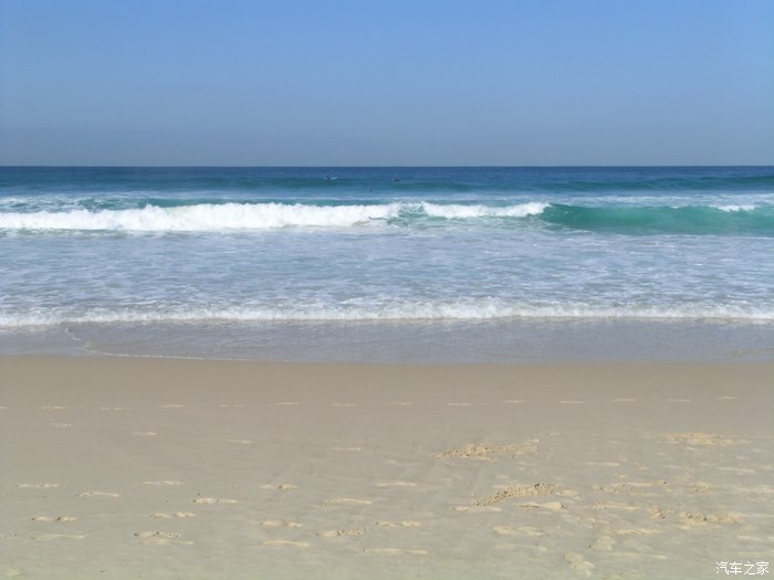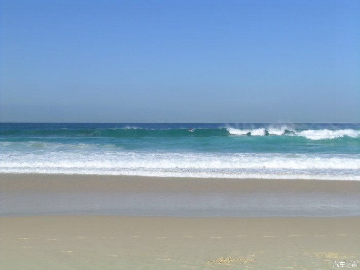 邦迪海滩,黄色的沙滩,白色的浪花,近处的绿色海水,远处的深蓝海水,中间的小红点有木有?是冲浪的勇士。一切显得那么和谐、安宁而美妙