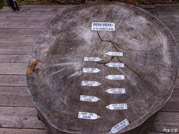 有钟造型设计的木头指示牌吸引了不少游客的视线,踏过这里就是真的出发啦。这里的树木已有些年头了,因为有些年头,这里有些树木已经失去了原有的风貌,倒了下去,虽说杂乱无章的树根在眼前呈现着,但是也十分的吸人眼球。被锯掉的沙松冷杉,已经有262个年头,风貌依旧的不变,还是如此的吸引人目光,不由的感叹大自然生命力的顽强。