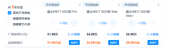我们从之家的车型介绍了解,猛士M817目前在售车型共3款。价格从31.99万到36.99万。