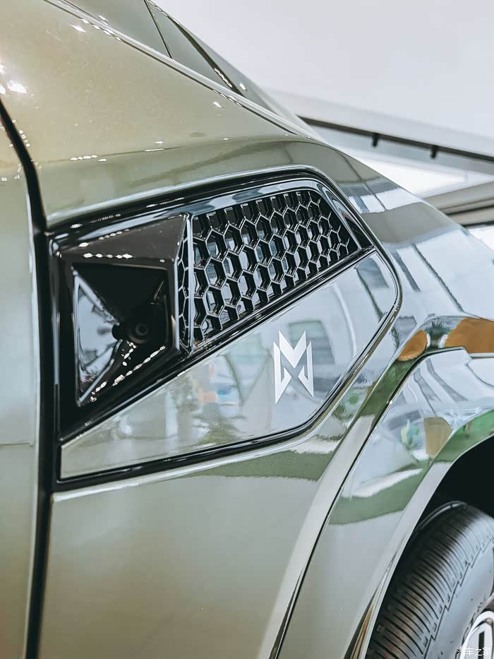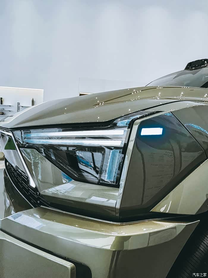 这科幻般的威武造型,真的是极少见的设计。但是太太太对我的胃口了。展车的颜色称为秦岭绿,是一种非常高级的颜色,看着很清透阳刚。搭配这么威猛的造型,非常有质感。大抵是满足我们这些没当过兵的男孩(男人至死是少年)一个绿色的军营梦吧。矩阵式LED大灯被一块发光中网连接到一起,横向视觉很强烈。中网上发光的猛士标也非常的霸气。科技感强烈,仿佛是来自未来的战车。