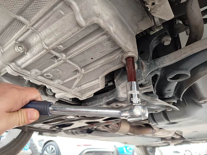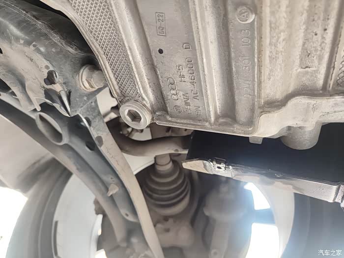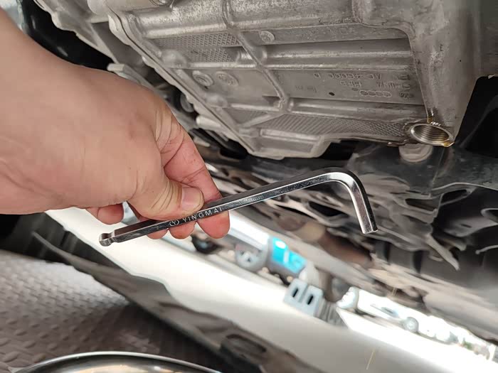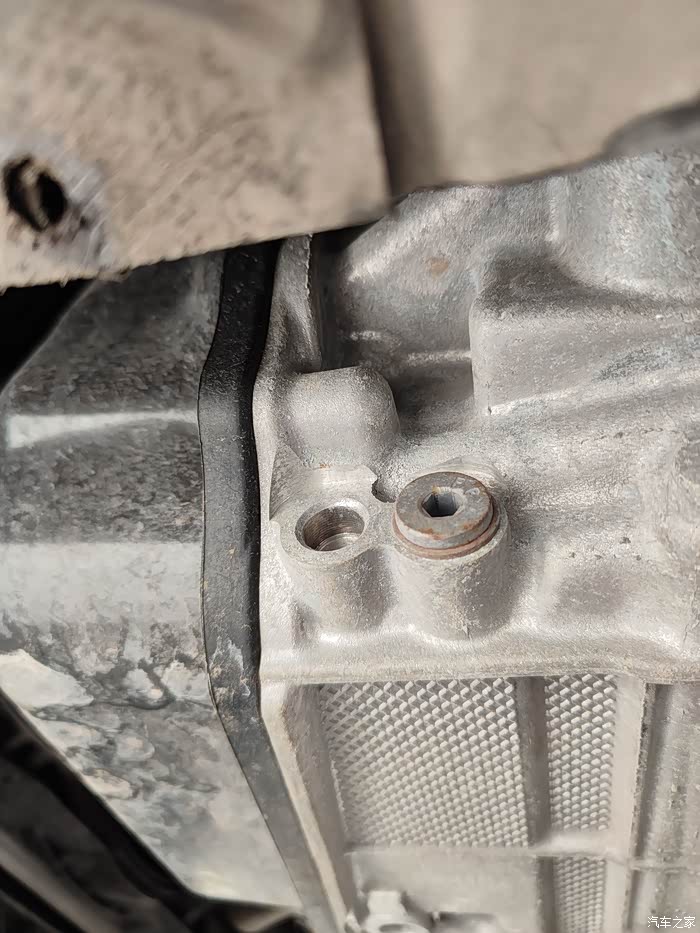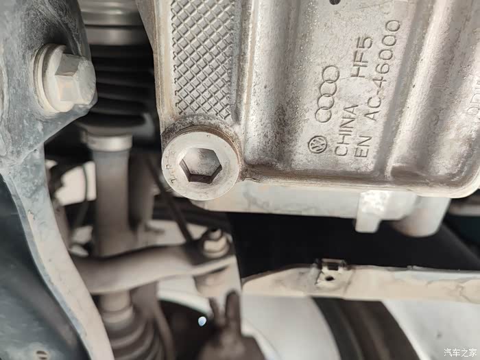 油全部加完之后,就是把放油口一螺丝装回去拧紧就行了。由于这次放油是放多少,就加多少。所以没有进行量油排油操作。如果需要进行更换变速箱外置滤芯的话,热车状态下量油排油操作是必要进行的,而且必须买6升变速箱才行,换滤芯的话,5升油是不够的。