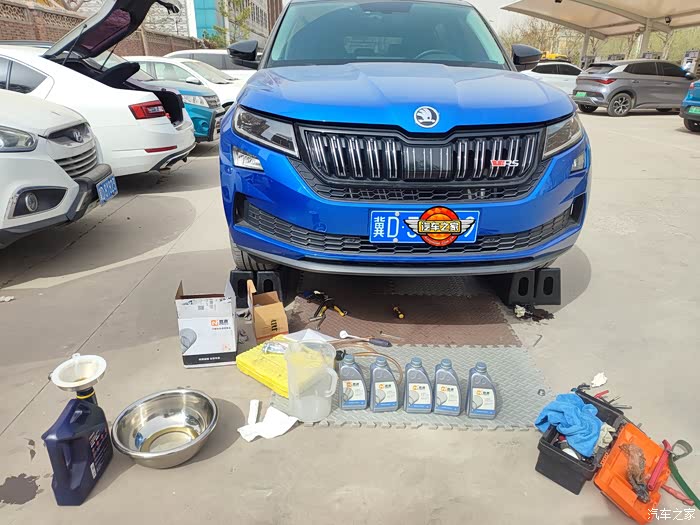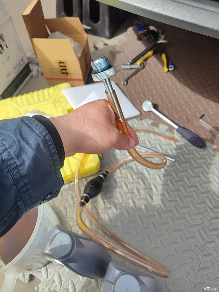 然后就是加变速箱油。两到三分钟就可以把这5升机油全加进去,挺快的,也不费力。。
