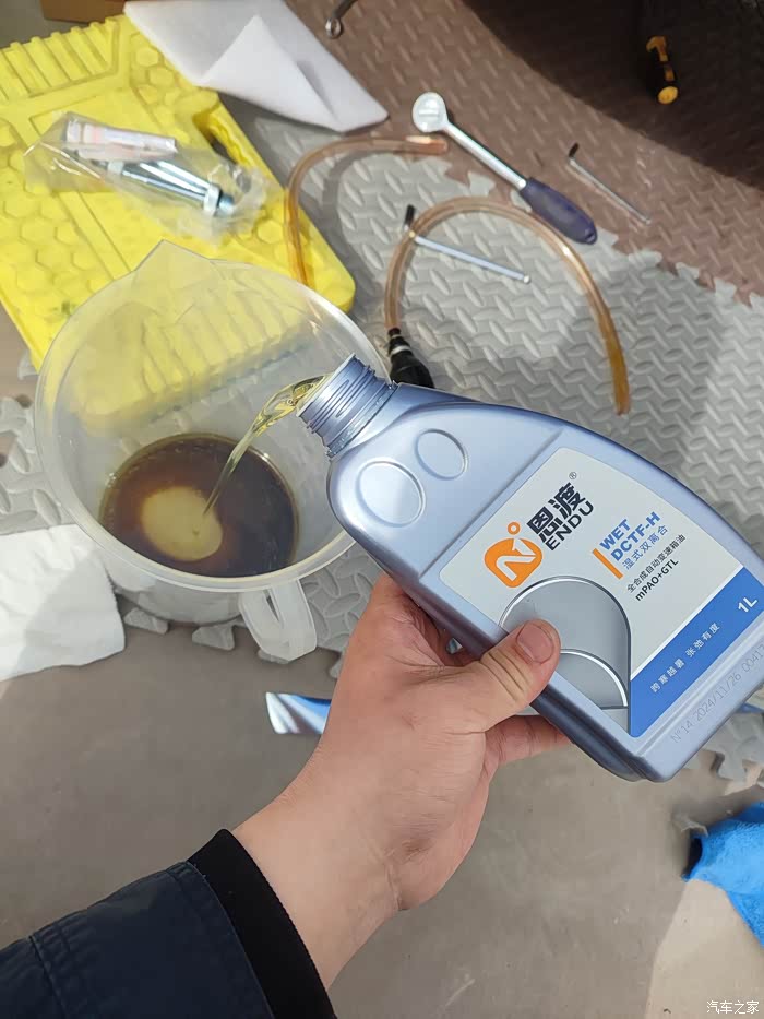 然后把5升新变速箱油倒进去,恩渡新油的颜色还是很清亮的。给变速箱油混合其他机油是本人自愿的,不建议大家模仿,有可能会导致变速箱出问题。但是我个人想当然的认为,加点高含量酯类油进去,变速箱可能会更好开一些,请勿模仿,特此声明。。