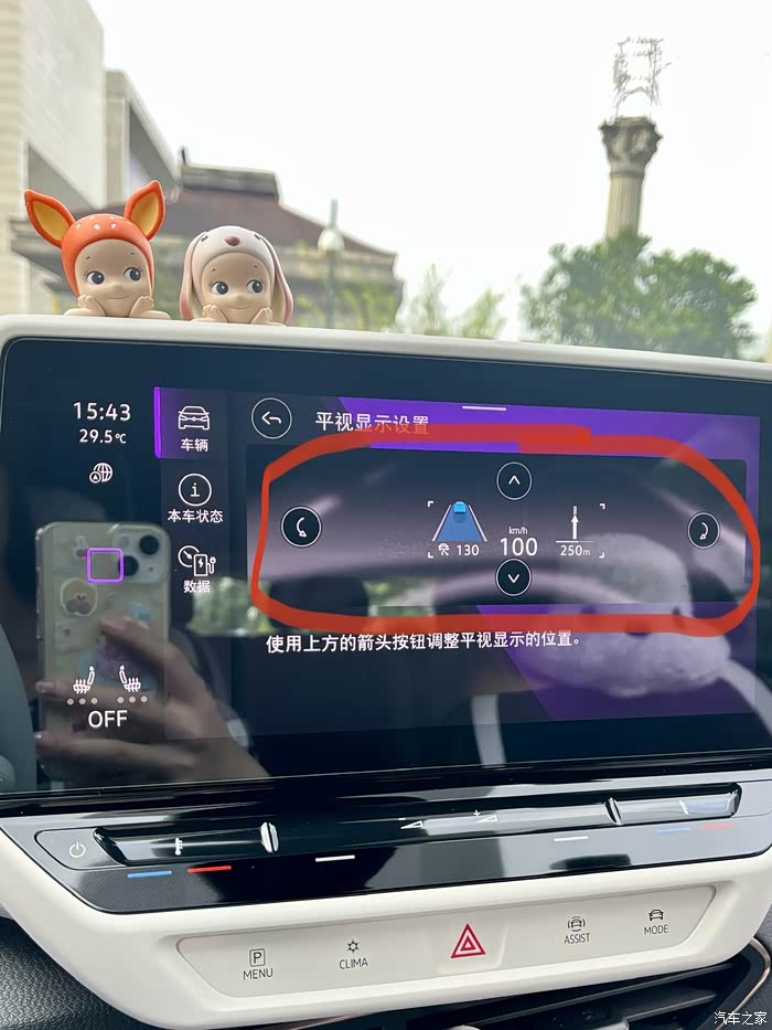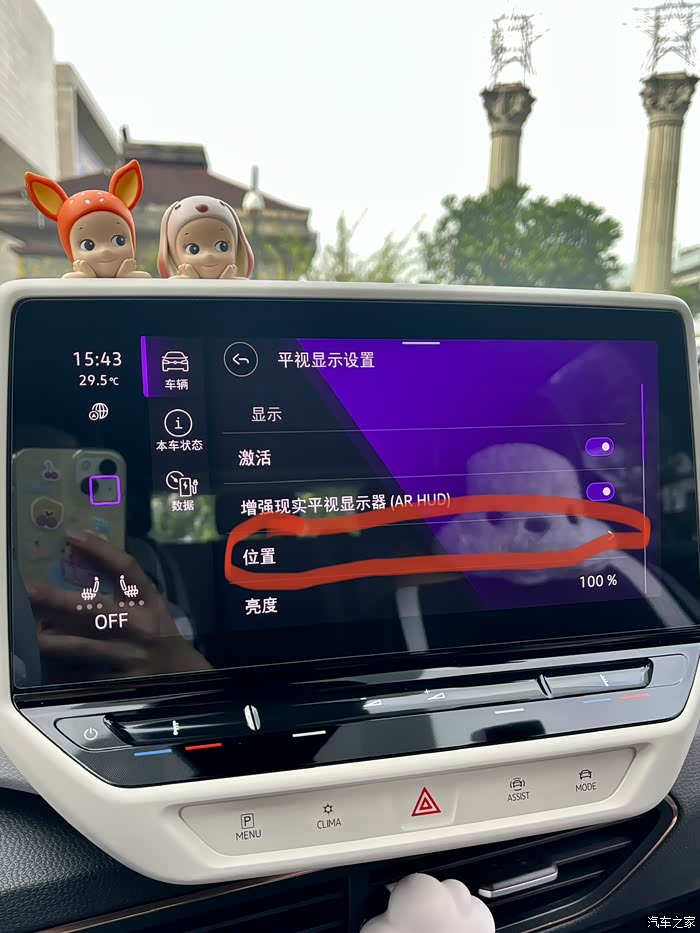 三、平视显示设置问题,前几天有个车友问我ID的HUD可以调整高度吗?是不是只能通过座椅调解高度,答案是可以调整的,1、在车机内点击车辆2、点击平视显示3、点击位置4、根据自己习惯调整上下左右的高度