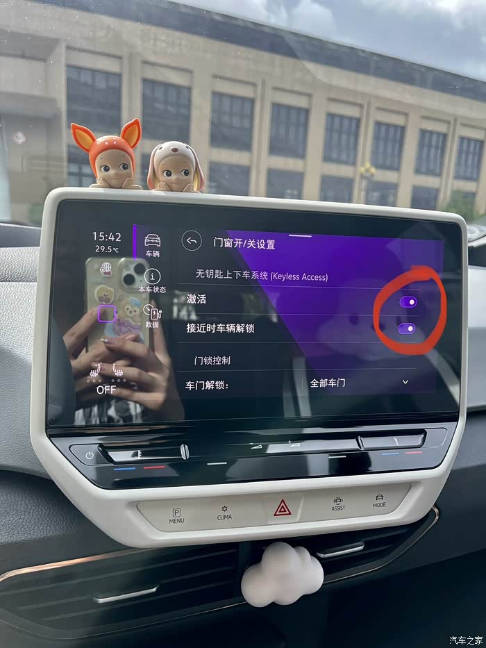二、无钥匙上下车系统到底怎么去设置,又怎么使用,现在就对这个功能进行讲解,首先是设置靠近自动解锁:1、在车机内点击车辆2、点击外部-门锁3、打开激活和接近时车辆解锁功能就可以啦,还可以另外设置解锁是是解锁几个车门