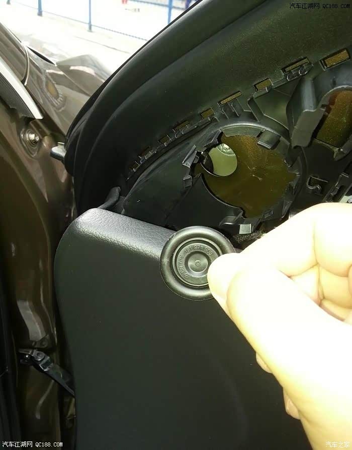 取下喇叭后的密封垫胶片,露出后视镜固定螺丝