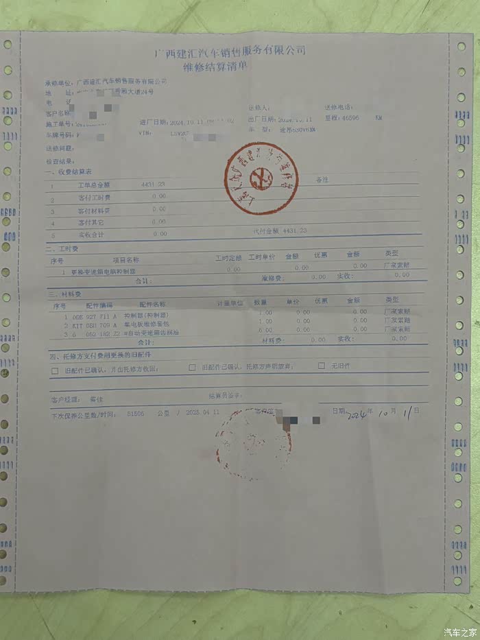 8月底变速箱开始出故障(无法挂入倒档),去了第一家4S店索赔,申请了半个月说要自行负担20%的费用。然后又去了第二家4S店索赔,直接免费帮处理好了(就是订配件花了一点时间)。感谢靠谱的4S店让我的途昂又能安心使用了。希望这次变速箱能撑得久一点别出故障吧……