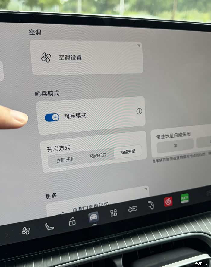 一开始我还不知道这台车有这配置,研究的时候才发现,只要插个内存卡就行,不仅能当行车记录仪用,还能开启哨兵模式。操作也特简单,在车辆设置里找到“车辆控制”,点进去就能开,还能选立即开启、预约开启或者持续开启,旁边的感叹号里还有详细介绍,想回看记录的视频也能在这儿找,特别方便。