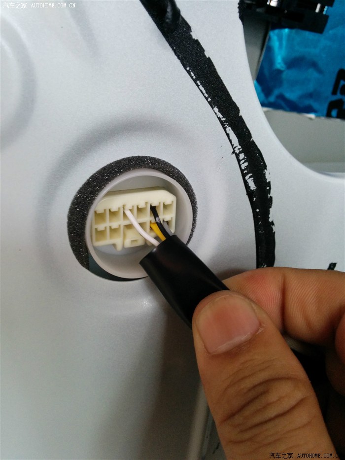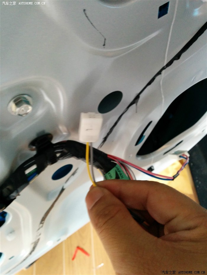 这个插头位于门板上靠右边,想装的拆开就能看到这玩意。中控马达开锁线接黄线、中控马达关锁线接灰线。