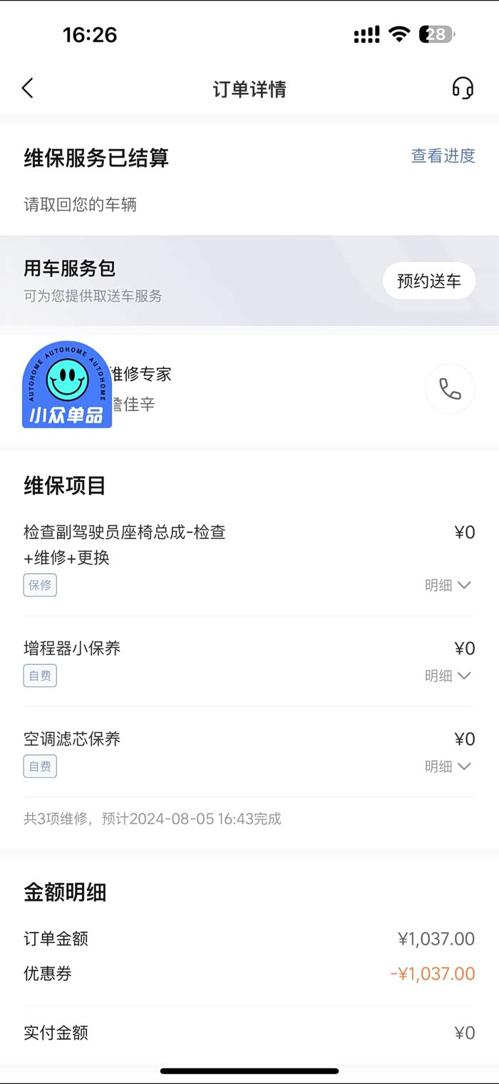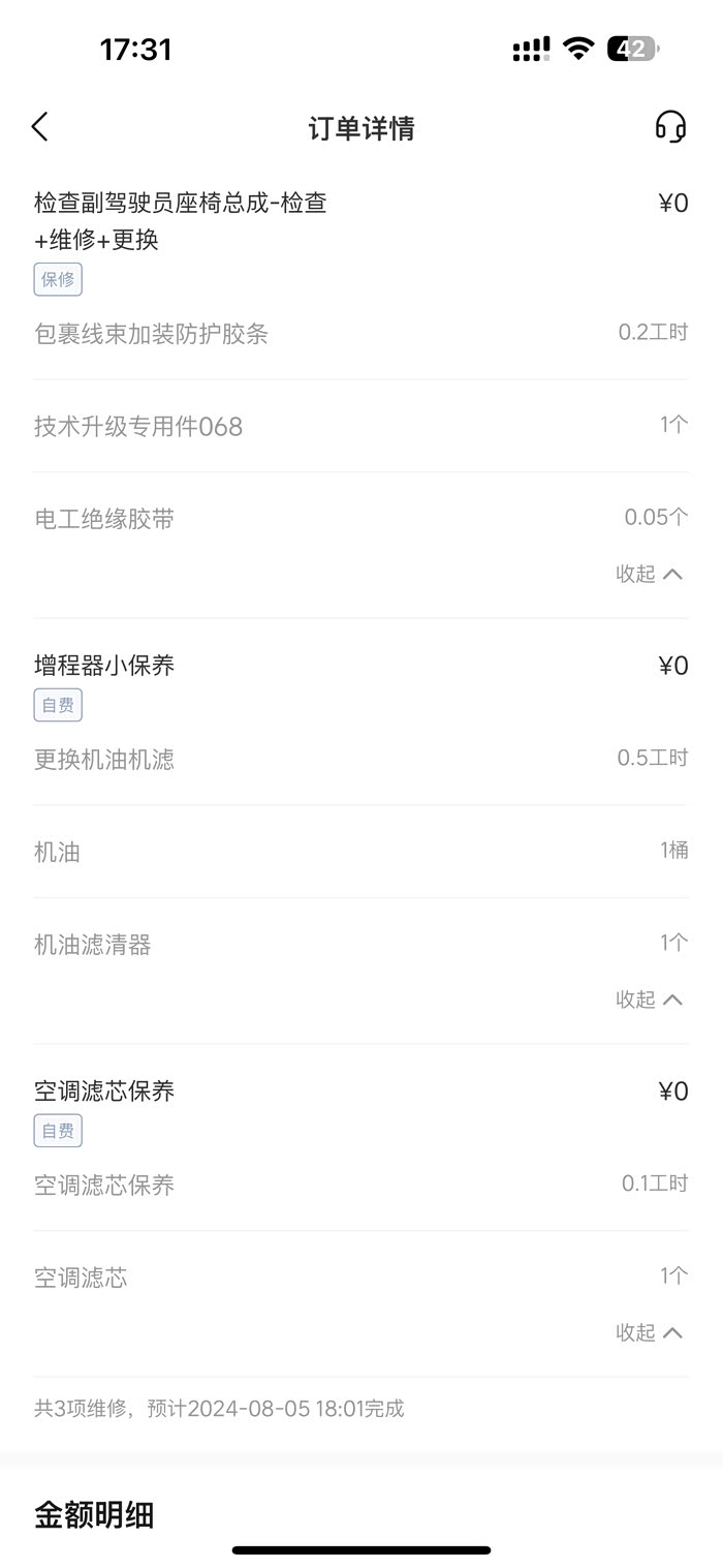 保养的项目:空调滤芯保养、增程器小保养、副驾驶座椅总成更换维修。