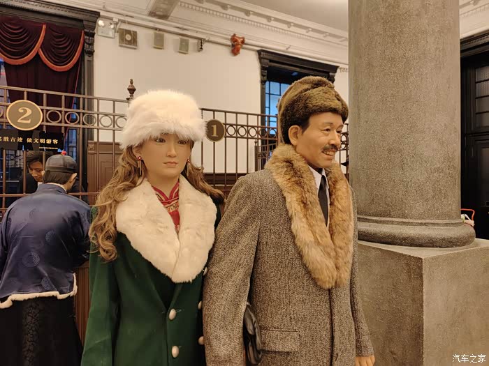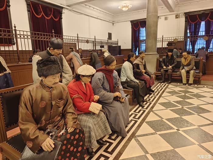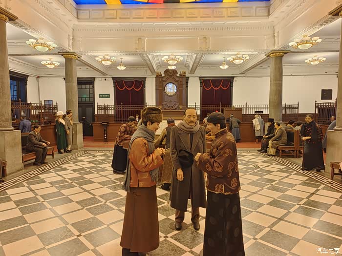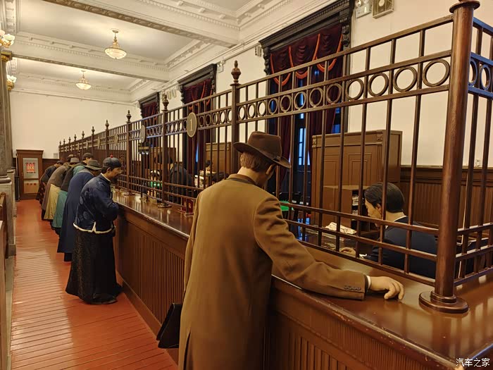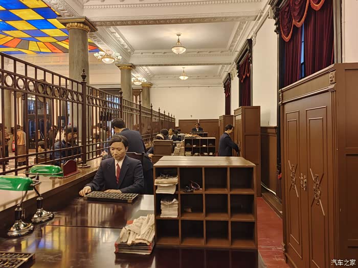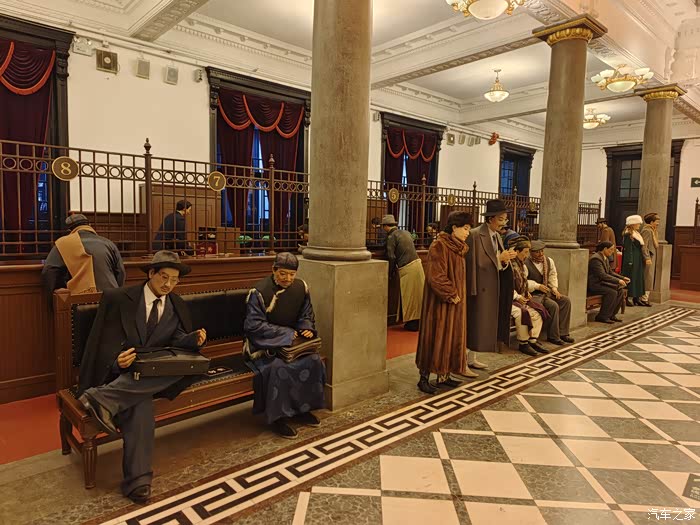 大厅采用场景复原的方式,摆放着80多尊硅胶人像,生动再现了边业银行当年的营业盛景。这些硅胶人像穿着各式民国服饰,有西服革履的绅士、旗袍长裙的贵妇、忙碌的柜员等,他们或在窗口交易,或在一旁寒暄、等待,栩栩如生。