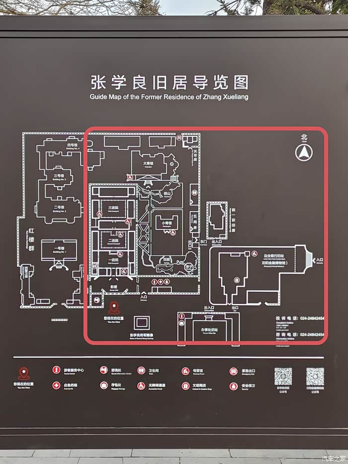 如下图所示,张学良故居分为西院、中院、东园三个部分,西院为“红楼群”,现为沈阳博物院办公区,可参观的区域为红线内的中院和东院。