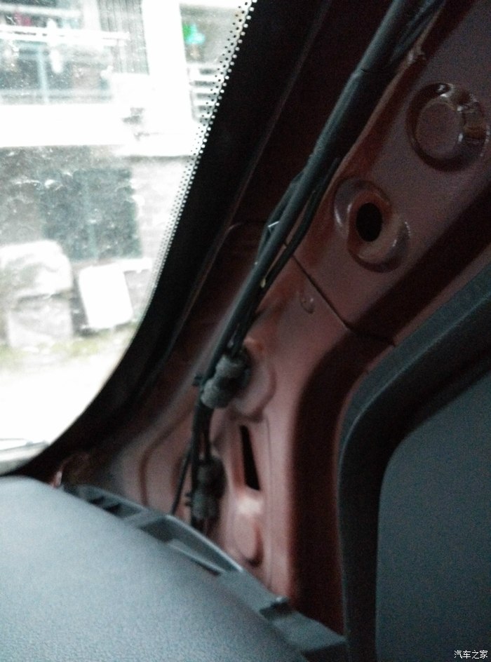 电源线从前挡和车顶内饰那个缝隙一路塞到副座那边的A柱这里,A柱的内饰板要取下来,再接着就要顺着这几根线一起走,一路要用小尼龙扎带固定是最好的,A柱下来一路多扎几条,没有扎带的也可以用电工胶布粘来代替,一个人安装只拍了才扎一根的照片。