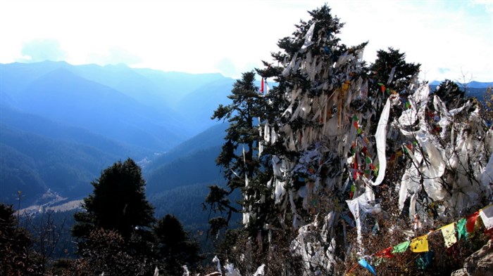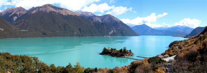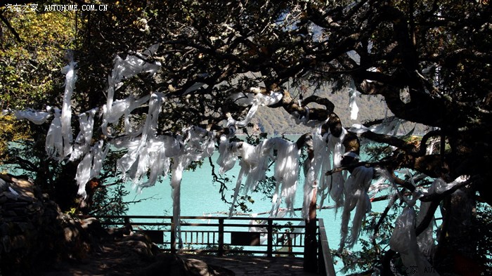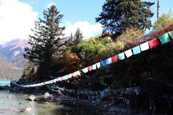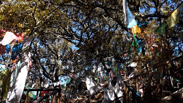 穿过挂满五彩经幡的青冈树林,登上布多山观湖台是俯瞰巴松措全景的绝佳位置