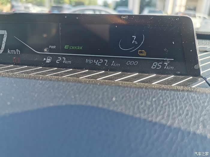 就这样一路忐忑,终于到达了目的地充电站,显示续航里程还剩27km,电量仅剩7%了。