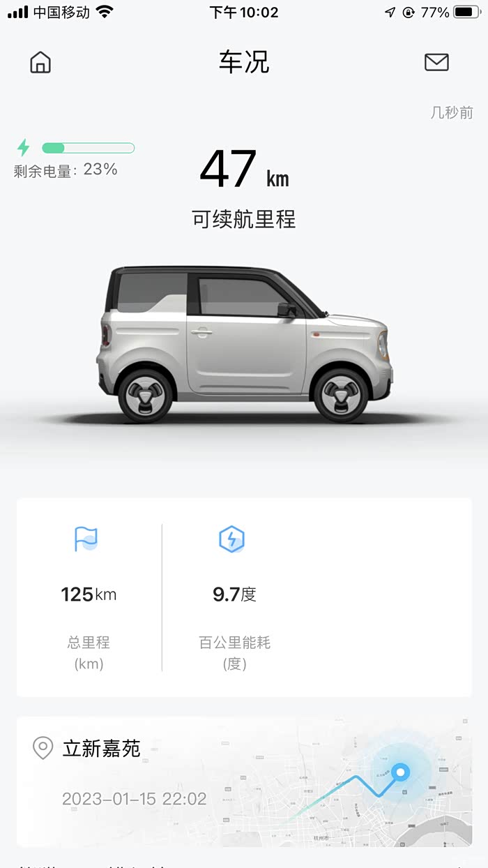 提车时4S店充满电提的车,显示续航200公里。我这山东枣庄,这几天最低气温-8,市区开了118公里之后,还剩余电量23%,剩余续航47公里。冬天的续航还是有点崩的,这120公里我没怎么开空调,要是开暖风,估计续航得打6折。
