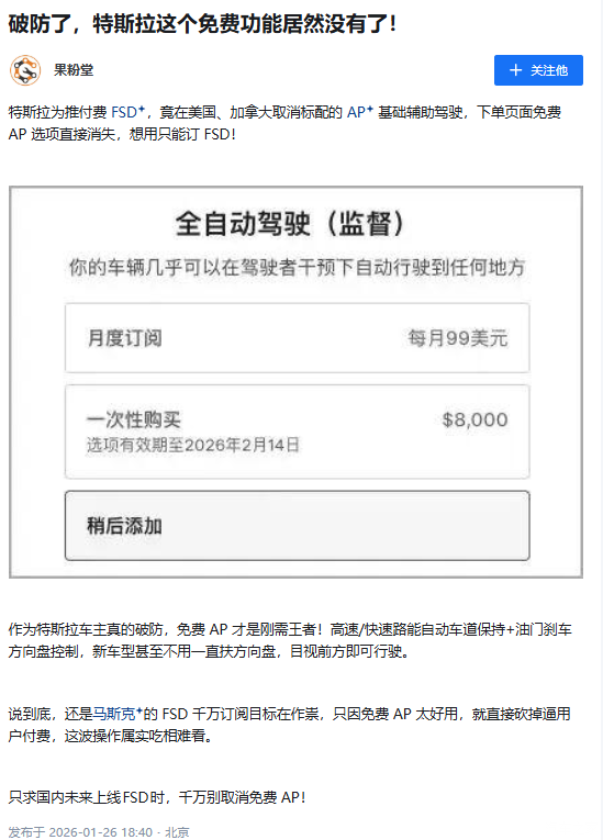 要是真的取消了,我就彻底放弃特斯拉,就因为有AP才买的特斯拉!!TMD ,老马也太不要脸,背刺老用户!!