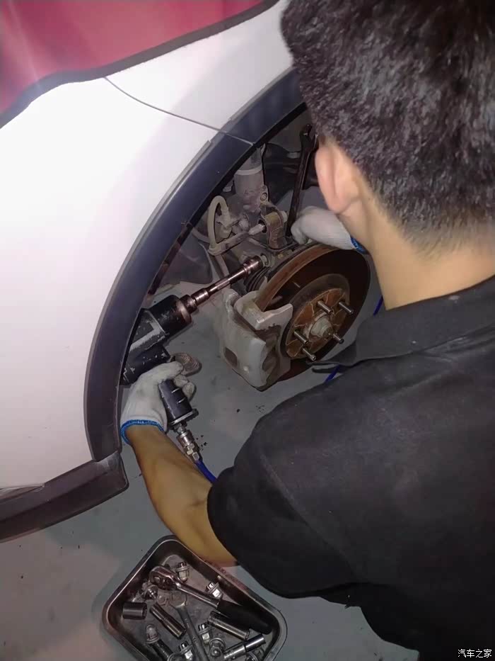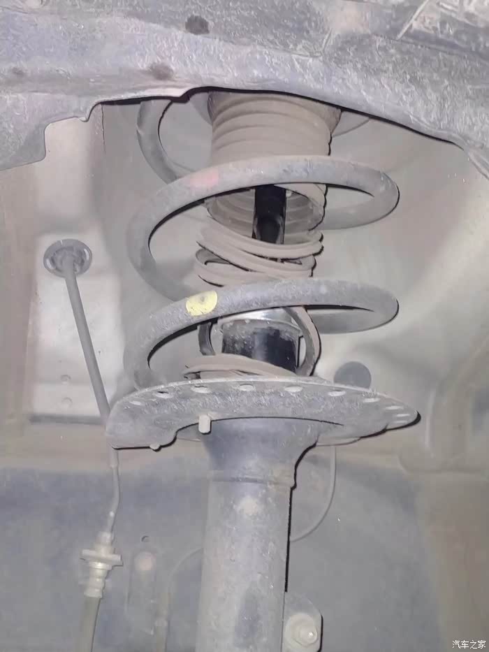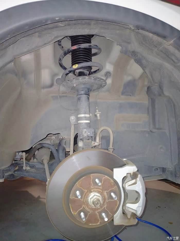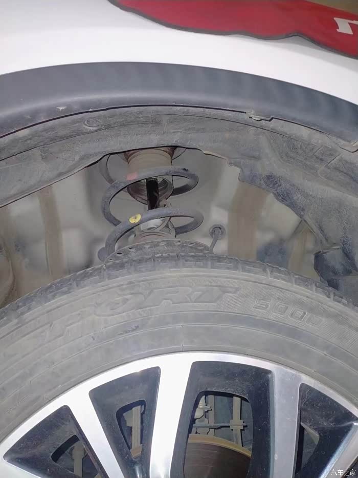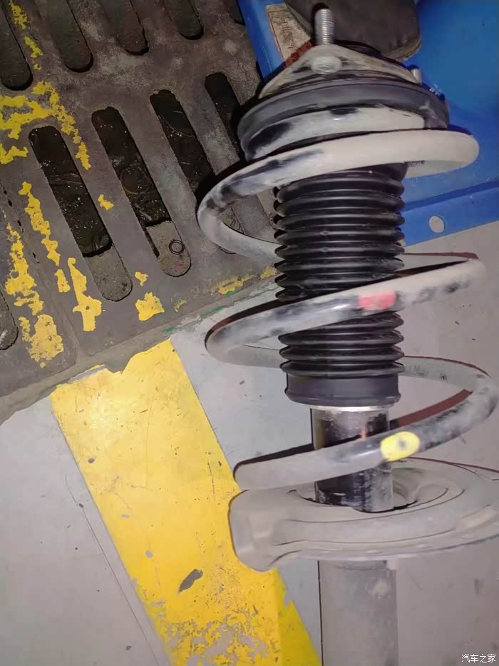轮胎拆下去之后,特意照2张特写,大家有时间也看看,之前真没注意到这个减震器防尘罩。维修小哥也特意看看,确认缓冲器坏没坏。我一脸懵B,根本不知道是什么东东。