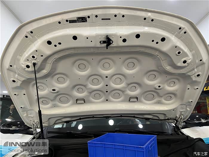 原车引擎盖只是一层铁皮结构,汽车行驶时引擎盖部位很容易产生振动噪声。所以技师先使用欧铂止震板对引擎盖做止振处理;再使用银色棉对引擎盖做吸音处理,进一步提升降噪的效果。