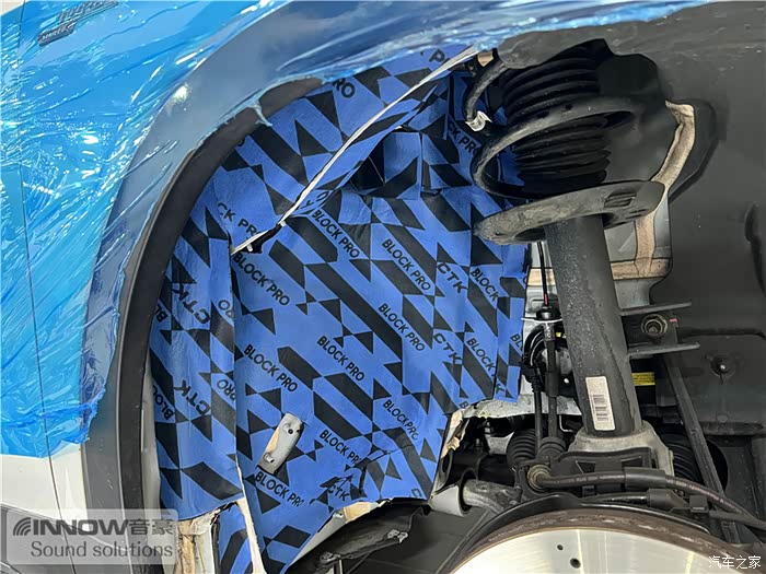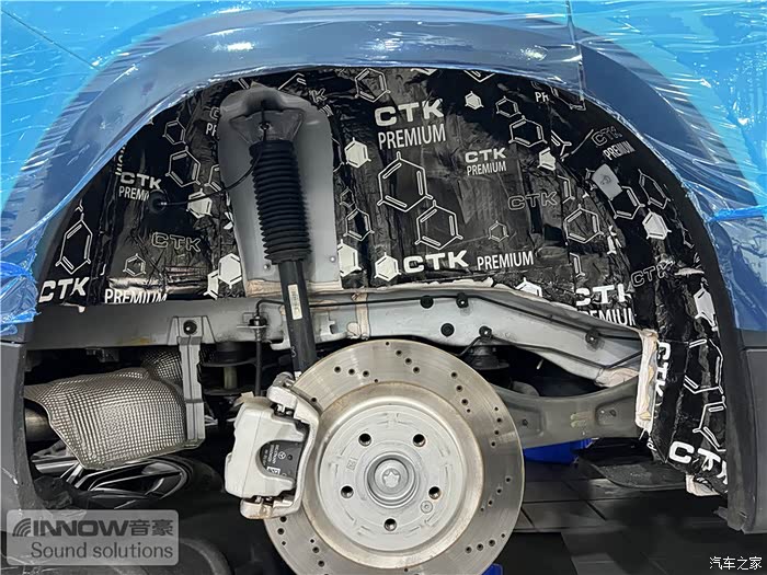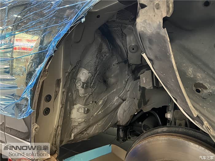 经过检测,技师发现原车的噪声主要有两大类,第一类是路噪和胎噪;第二类是来自发动机舱内的噪声。因此技师使用欧洲环保隔音CTK,对汽车的四轮翼子板、引擎盖和仪表台下方,做了针对性的隔音处理。