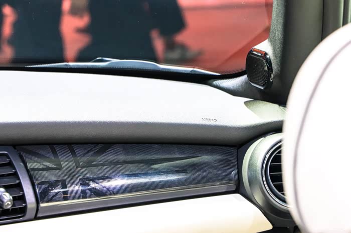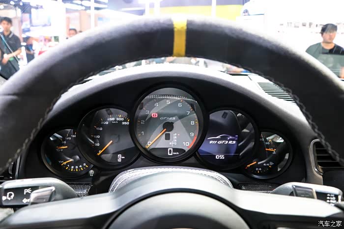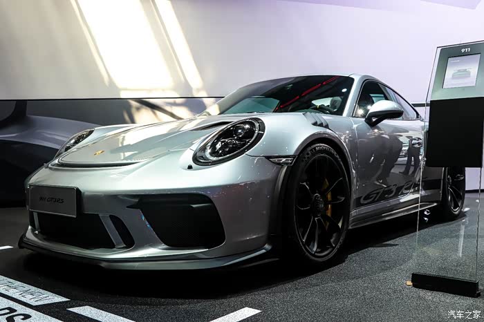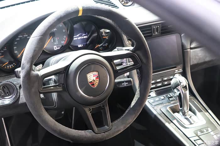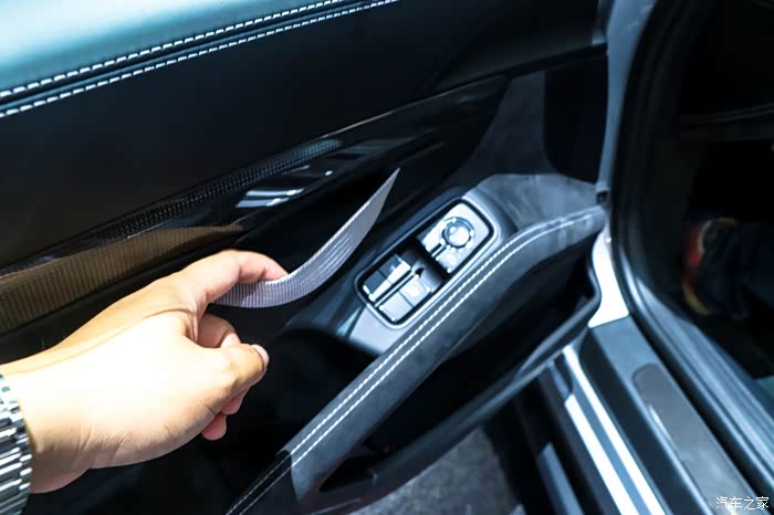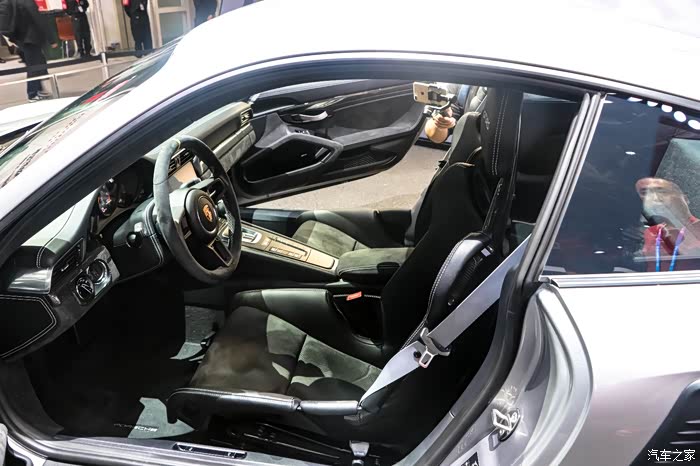 911 GT3 RS是我在北京车展上,车内呆得最久的车,没有之一。并不是因为有多喜欢,而是因为我找不到打开门的拉手。为了追求极致的性能,尽可能减重,门板上的拉手就用一根布条代替了,甚至连车头的金属Logo也被贴纸取代了。