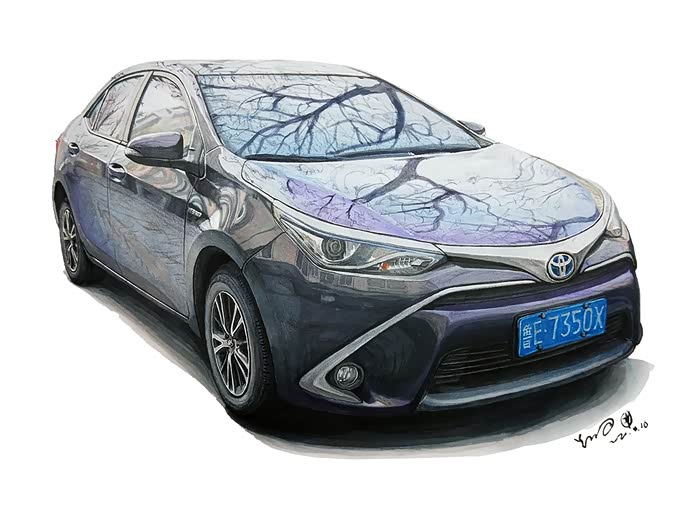 除了工作的家,还有移动的家~第一辆爱车丰田雷凌双擎,这辆车已陪伴我十个年头,重拾画笔后就给自己的车手绘了一幅,当时的绘画风格以细致真实为主,但再真实也没有照片清晰,所以后期画的作品都是以改装为主,更具挑战更具吸引力。