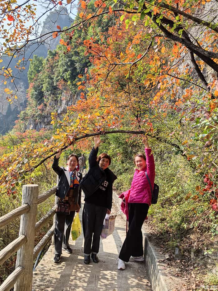 徒步行走在通往神女峰的山道上,我被这浓烈的秋冬气息所深深陶醉了。金黄的树叶染红了漫山遍野,这里一丛,那儿一簇的,把山林渲染得绚丽多彩,就像丹青高手随意泼洒的颜料。江边两岸赤枫、黄栌仿佛得了什么召唤似的,层林尽染,把这山色浸染得流光溢彩,绚丽多姿。有赤红、紫红、金黄。要是在晚霞中观赏,那更绝美了。柔和的霞光照在江面上,把一湖的秋水染印得五彩斑斓。堤岸那火焰般的红叶倒影在静谧的江水中,真的成了一个巨大的颜料池。山上,水里形成了一幅对称图,堤岸成了天然的中间轴了。不少摄影爱好者被这眼前的绚烂美景渲染得如痴如醉,纷纷端起手中的相机,生怕眼前这幅多姿的画卷会稍纵即逝。