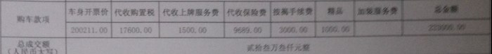 裸车200211,购置税17600,上牌费1500,保险9689,建行免息手续费3000,精品1000元,合计23.3W