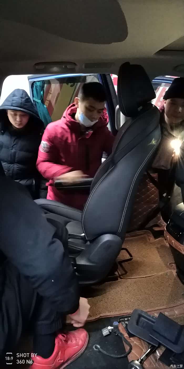 改到这里,基本上算改完了。但是我发现了一个问题:每个座椅都可以360度旋转(当然,咱们最好只转180度就好,因为底座下面还有按摩和加热系统的连接线),但是,两个椅子不能同时都转180度。因为咱们的D90第二排座椅的导轨是斜的,而且座椅也没有在导轨的正上方,而是偏向车门一侧。所以旋转180度后,座椅向中间偏移了7、8厘米左右,导致另外一张座椅无法旋转过来。达不到我要的效果,只能睡一个人,无法睡两个人的。所以我还得想办法,于是到另外一个熟悉的房车改装厂,长沙著名的猫哥开的改装厂,重新切割下来,再把转盘偏向车门一点,这样在不影响原车导轨的情况下,尽可能的达到两个座椅都可以向后转180度。