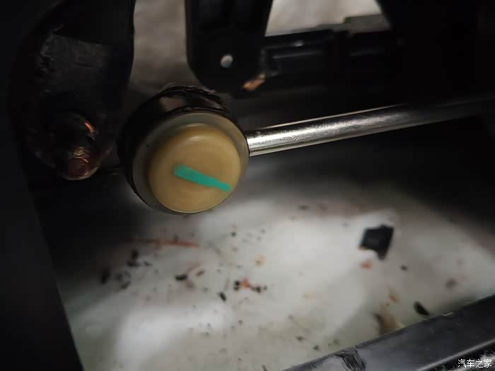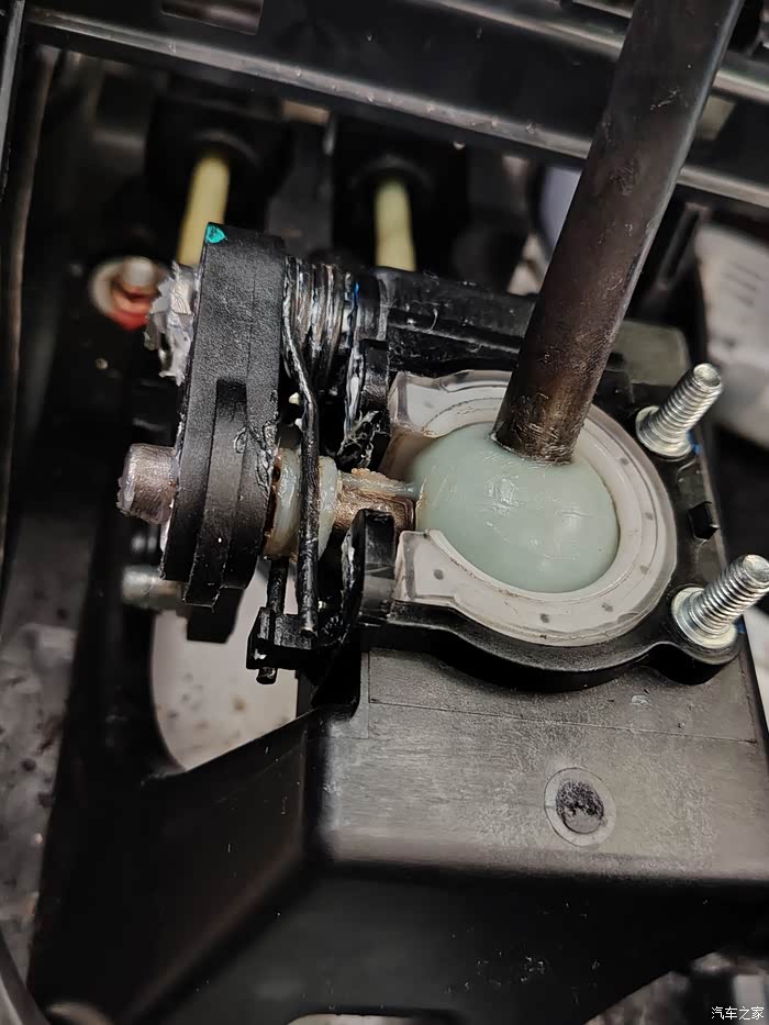 这时已经能看到球头跟档位控制栏杆了,但是不要着急,我就是因为着急,破损的尼龙块强拔出来,档杆球头跟黑色底座的缝隙不足以把新的尼龙块塞进去,浪费两个小时(建议让汽修店换)。