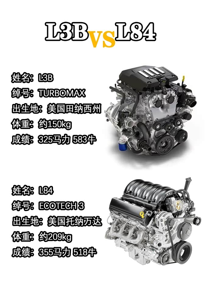 讲个冷知识:2.7T的太浩零百加速要比5.3L V8自吸快,前者8.5秒,后者实测超过9秒了。这个数据也得到了海***体实测,L84太浩0-100要9.73s。?L3B(2.7T L4):通用家族技术最新的发动机之一,最大功率和扭矩分别可以支持到325Ps、583N.m,因为通用希望在这颗机头上实现一些“违背物理学”的突破,比如让涡轮机开起来像自吸一样平顺(消除涡轮介入前的延迟);比如让涡轮机的“耐操”能力达到比自吸大排量更强的程度(因为是给干重活的皮卡用的,所以一直会遇到高载重和拖拽场景);比如让涡轮机吃粗粮也能发挥高性能(中规太浩和育空的官方标号油品就是92号)。所以他是四缸,但他是个非常强的四缸?L84(5.3L V8):贵为大V8,但作为第五代小缸体发动机架构的一部分,它的实际年龄从L83算起已经超过10年了,OHV顶杆机结构的优点是技术非常成熟,造价成本低,配件丰富,可以和通用其他的small block发动机互换部分零件。但缺点是相较于更大排量的L87(6.2L V8),L84的输出功率其实非常一般,只有355Ps,518N.m的最大扭矩和L3B比起来也是很不够看。所以通用心里也是很清楚这台发动机已经“廉颇老矣”了,所以才会在部分全尺寸车型上开始用L3B来代替。这两颗发动机的关系很像F1从2.4L V8变成1.6L V6,切换前全世界都在质疑缩缸缩排量的F1还快的起来吗?最终这一疑虑被一个又一个最快圈速给打破了。不过各位也不用担心,通用没有像福特一样放弃了V8,满足下一代北美排TIER5放标准的新V8还在研发过程中,大家可以拭目以待一下。