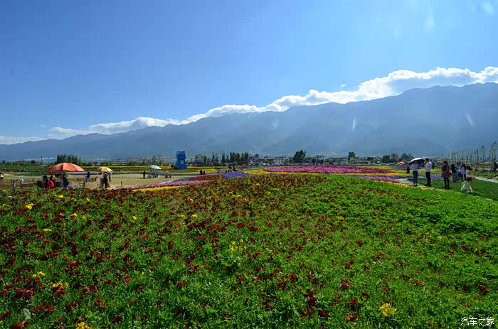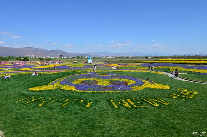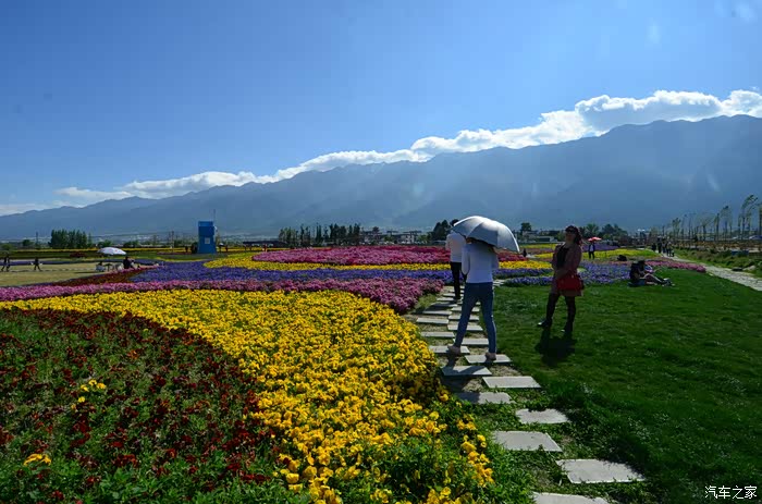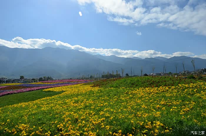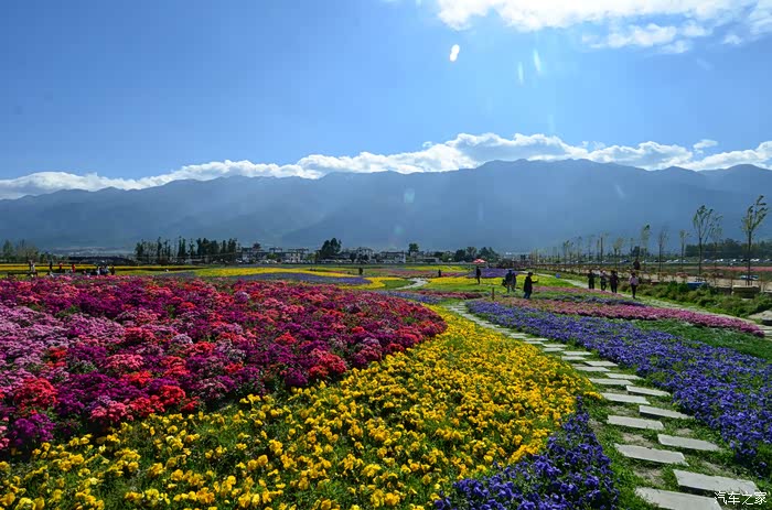 走进大理花海,竟相绽放的角堇、虞美人、石竹、羽衣甘蓝等各色鲜花色块色泽鲜明,如春意盎然的五彩画卷,在微风的吹动下花浪翻滚。