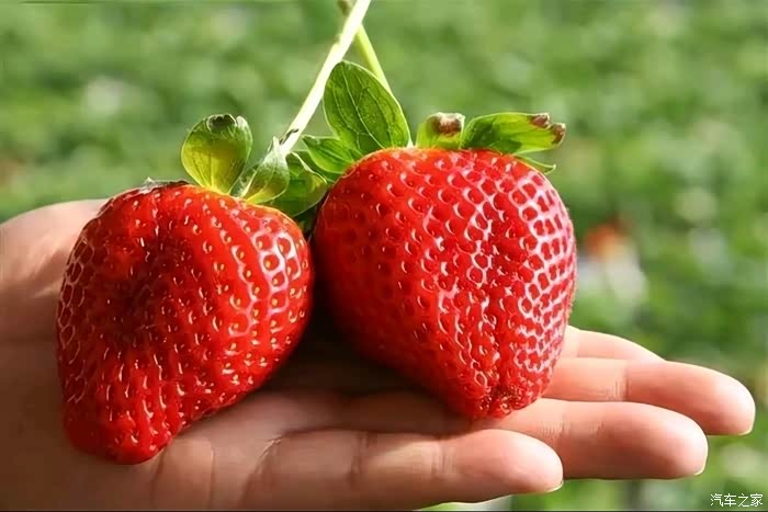 快看我找到两个双胞胎的草莓,两个都很大,像土鸡蛋差不多大。两个草莓放在手掌上都放不下了。