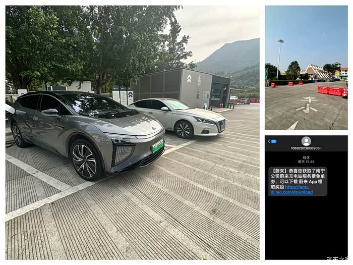一是从桂林酒店开到贺州服务区补电,行程228公里,用蔚来充电桩补能,扫码领一张免服务费的卷,充了57度电,只收43元电费(比服务区双向装修中);