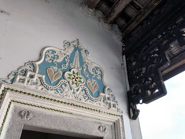 中西合璧的细节,中式的木制屋檐和西式的门顶装饰。