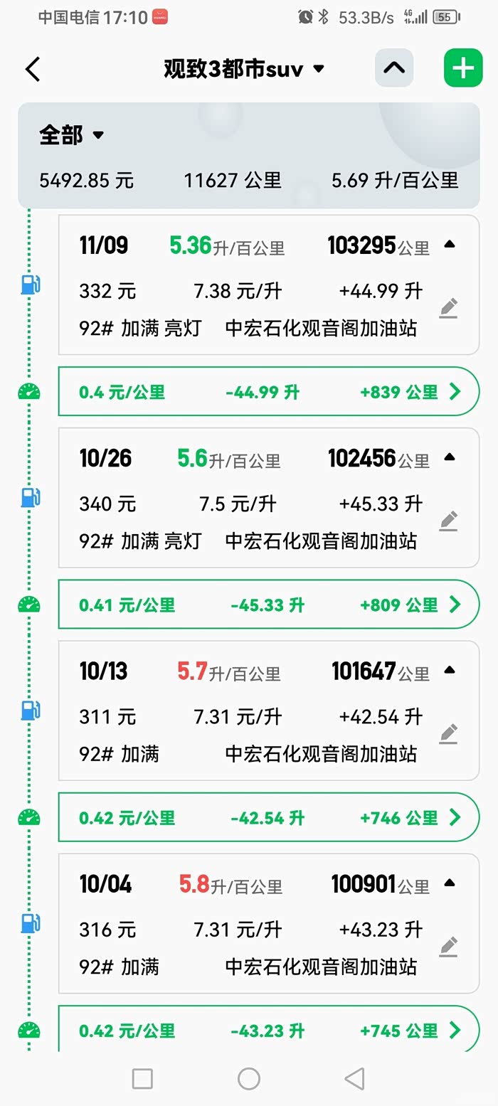 我这款是2015年的观致3都市SUV,平常就是上下班,常年在苏州驾驶,每天上班的路上,就是一个字“堵”,这一堵,就是油耗蹭蹭蹭涨,还好现在油价,也能接受,不能接受也没办法,每个月油费都是400块钱,上下班12公里,平时也开车出去玩,整体来说,这油耗还能接受。