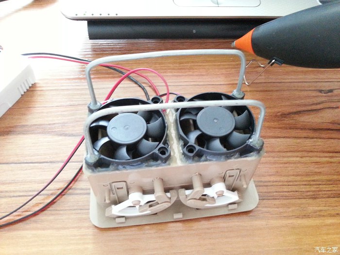 本次改装最重要且将贯穿整个改装过程的角色出场!热熔胶枪!用热熔胶枪将风扇固定在出风口上。