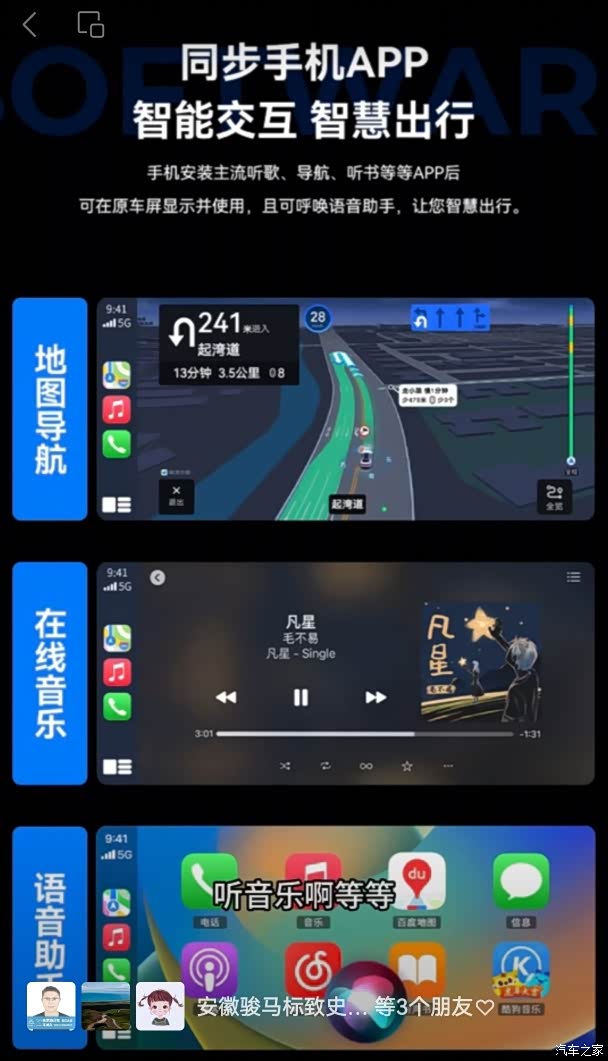 周末开车出去玩,用无线互联播放手机里的音乐,音质超赞,配合车内音响,仿佛置身小型音乐厅。导航时,车机大屏显示路线,比手机屏幕看着更清楚,再也不用担心错过路口。