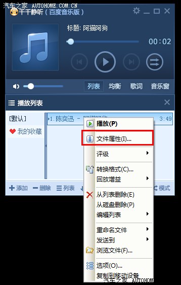 然后在歌曲名字上点击右键,选择”文件属性“。如下图: