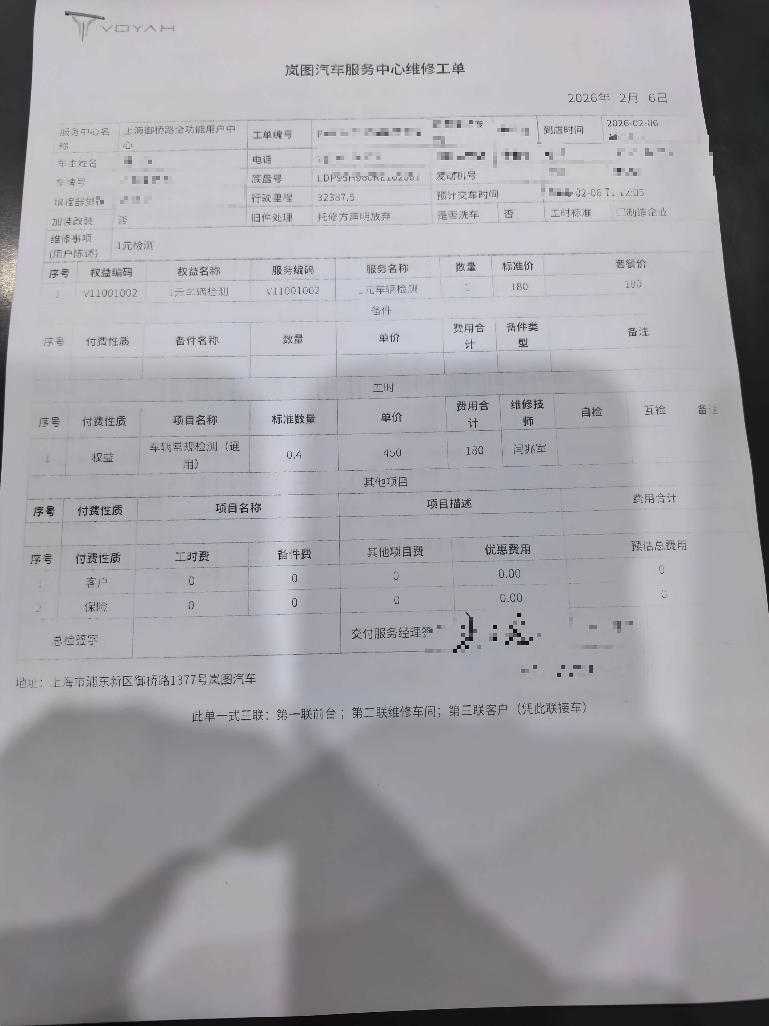 作为一名岚图梦想家车主,开了32600公里,我对这台车的满意度一直很高,而这次春节前的全车检查,更是让我对岚图的售后服务刮目相看。从贴心的洗车安排,到暖心的免费午餐,再到师傅细致入微的检查。马上就要开启上海→福州的春节自驾之旅了,有了这次全面的安全检查,我对这次旅途充满信心,再也不用担心车子半路出问题,可以全心全意陪伴家人,享受过年的快乐。