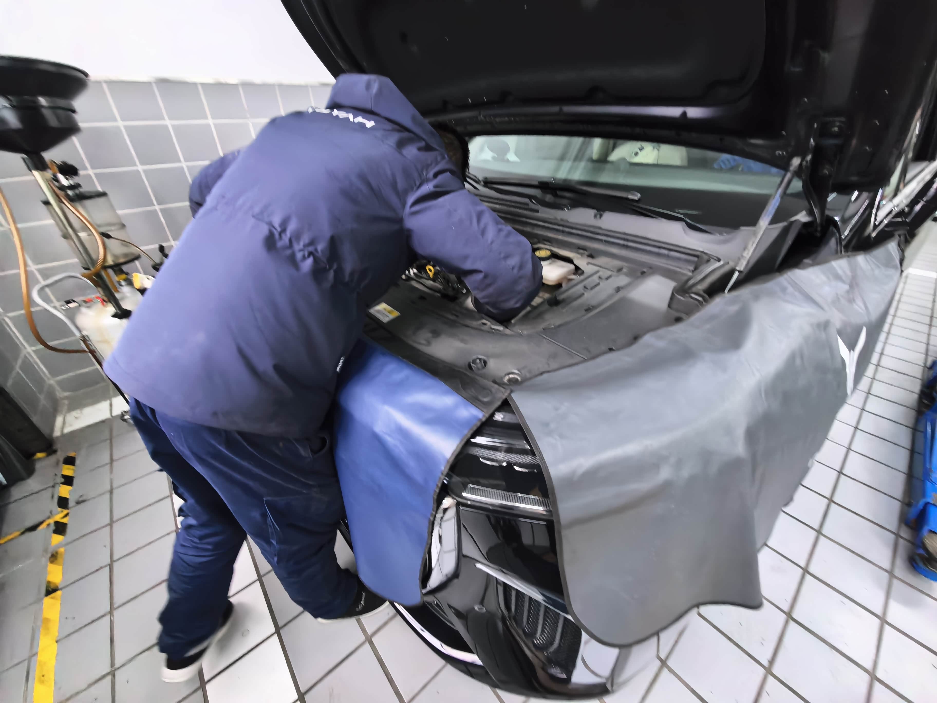 车子落下来之后,师傅开始检查各种油液。首先打开机舱盖,检查玻璃水,发现余量不多,师傅直接拿出专用的玻璃水,给我加满。春节高速上虫子、灰尘多,玻璃水必须充足,不然影响视线,非常实用。然后检查机油液位,拔出机油尺,擦干净之后重新插入,再拔出来查看,机油液位在正常区间,机油状态也很好,暂时不需要更换。另外,我的车小电瓶前段时间因为亏电刚换新,所以这次就不需要再重点检测了,跟师傅说明情况之后,师傅也点头确认,跳过了电瓶检测的步骤,节省了一点时间。
